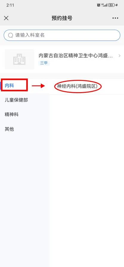 8、左侧导航栏点击“内科”,再点击“神经内科(鸿盛院区)”