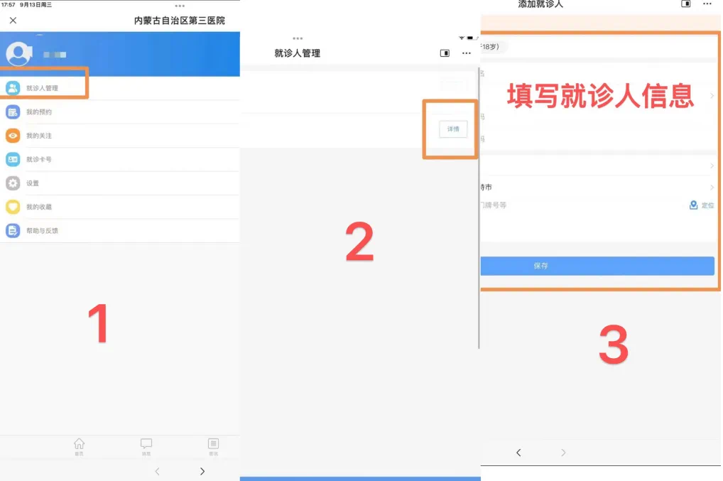 4、点击“就诊人管理”→“详情”→ “完善个人信息”→保存
