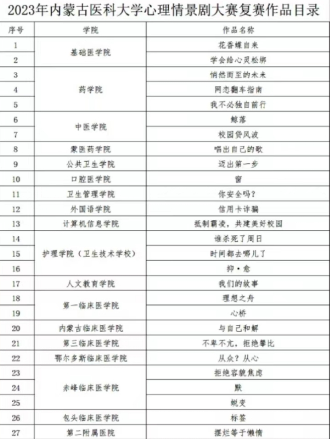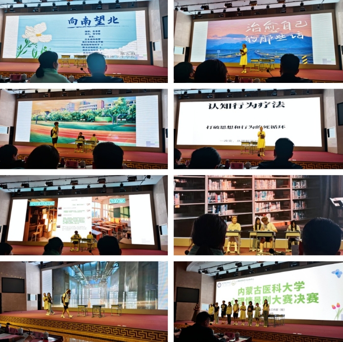 按照内蒙古自治区教育厅《关于举办全区大中小学校园心理情景剧大赛的通知》和内蒙古医科大学《关于举办内蒙古医科大学心理情景剧大赛的通知》,精神卫生学院通过前期院内初赛,最终推选出由9名大一年级学生原创的心理情景剧《向南望北》参加学校的复赛和决赛,并在5月17日举行的决赛中荣获第四名三等奖的好成绩。