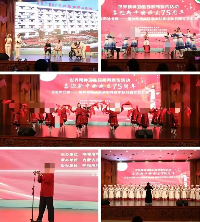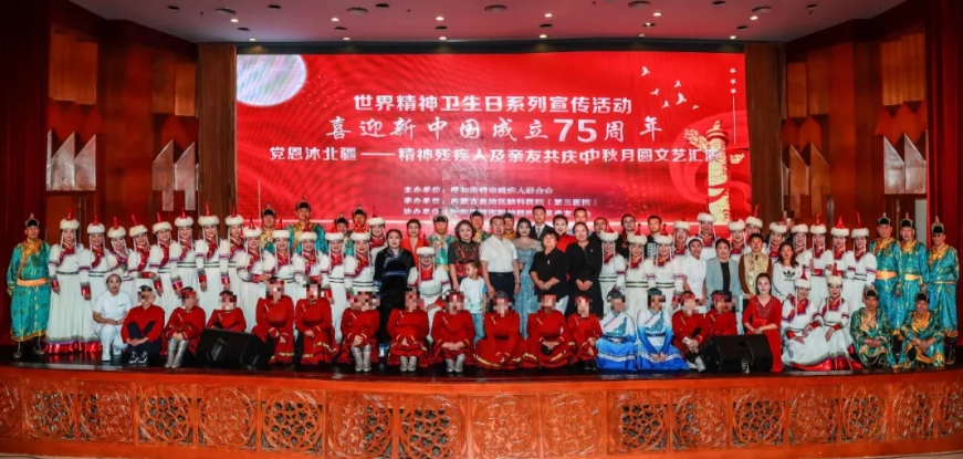 (第三医院)和呼和浩特市残疾人联合会、呼和浩特市精神残疾人及亲友协会共同举办的“世界精神卫生日系列宣传活动-喜迎新中国成立75周年,党恩沐北疆——精神残疾人及亲友共庆中秋月圆”文艺汇演活动在内蒙古饭店成功举办。文艺汇演在庆祝中华人民共和国成立75周年及中秋佳节的同时也展现了精神残疾人及其亲友的才华和精神风貌。