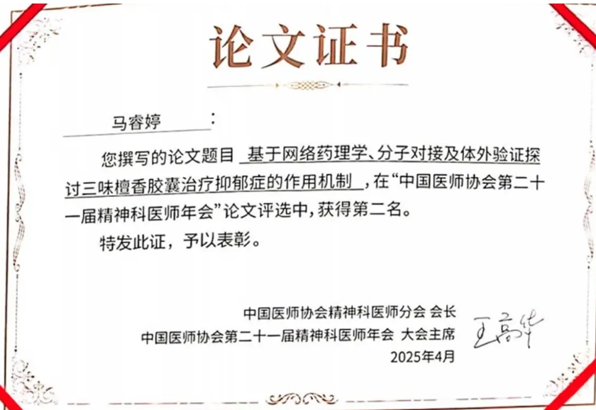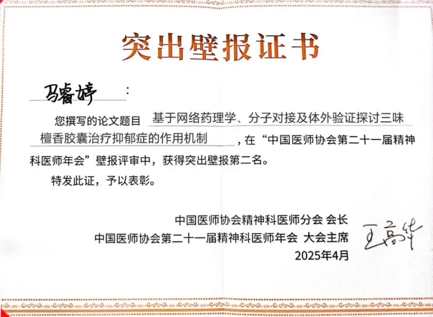 2025年4月8日至12日,由中国医师协会、中国医师协会精神科医师分会主办,浙江大学医学院附属第一医院、浙江大学脑医学与脑科学学院承办,浙江省医师协会协办的“中国医师协会精神科医师分会第二十一届年会(CPA2025)”在浙江省杭州市隆重召开。我院医学检验科主管药师马睿婷撰写的论文《基于网络药理学、分子对接及体外验证探讨三味檀香胶囊治疗抑郁症的作用机制》荣获大会论文评审第二名、壁报评审第二名。