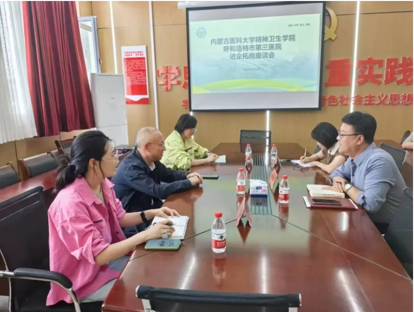 精神卫生学院始终高度重视学生的就业工作,积极开展访企拓岗活动,值此2025年毕业季,为进一步拓宽毕业生就业渠道, 5月28日,在学院院长安排部署下,我院党委副书记仝利俊、教学部相关人员前往呼和浩特市第三医院进行了访企拓岗座谈会,呼和浩特市第三医院党支部书记、院长孙志连、副院长甘燕子、科教科、人事科、党办(宣传)、医务、教学、护理、精防办等相关人员参加了此次会议。