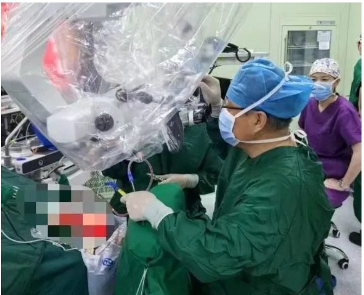 手术在全麻状态下进行,术前常规神经导航定位肿瘤位置,凭借天坛医院专家精湛的手术技巧以及我院手术室麻醉护理团队专业的配合,专家在神经外科显微镜下进行了精细操作,抽丝剥茧,暴露肿瘤,切断肿瘤血供,保护周围运动及感觉中枢,仅用时 3 个小时就完成了肿瘤切除。整个手术过程十分顺利,手术损伤小,尤为关键的是,术中成功保护了患者的中央前后回,使得患者术后肌力及语言功能相较于术前有了显著改善。