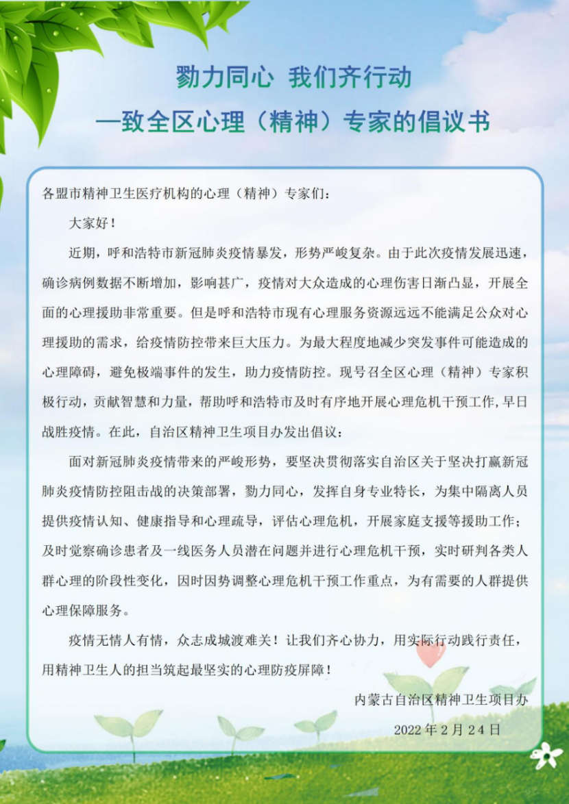 、自治区精神卫生项目办勇挑重担,积极响应,主动作为,隋晓杰院长(项目办主任)亲自挂帅,靠前指挥,统筹协调安排医院疫情防控工作和公共卫生工作。第一时间作出指示,要认真落实自治区疫情防控指挥部医疗防控组下发的“关于进一步加强新冠肺炎疫情期间心理干预和严重精神障碍患者管理的通知”,按照《内蒙古自治区针对呼和浩特市新冠肺炎疫情期间心理危机干预工作方案》要求,由自治区精神卫生项目办牵头,携手我院十二个医疗中心和十二个盟市,充分发挥专业优势,科学、规范地开展疫情期间呼市定点医院、隔离酒店、管控小区、封控小区(村)的心理危机干预工作。